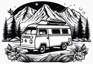 A camper tattoo can represent a love for camping and the outdoors, symbolizing the spirit of adventure, freedom, and connection with nature. It can also signify a desire for simplicity and a reminder to take time for oneself. Another interpretation is that a camper tattoo can serve as a symbol of travel and exploration, representing a love for road trips and the open road. Additionally, it can be a nod to the sense of community and camaraderie often found among campers, symbolizing friendship and shared experiences. A good location for a camper tattoo could be on the forearm or upper arm, representing the sense of strength and adventure associated with camping, or on the back, symbolizing the idea of constantly moving forward on life's journey. Below you will find a collection of camper tattoo design ideas for you to browse and get inspired by.