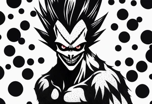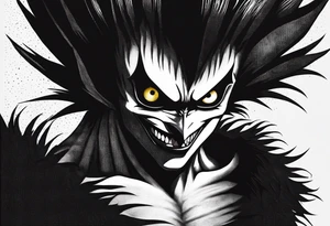 Ryuk is a character from the popular manga and anime series "Death Note". A Ryuk tattoo may symbolize a fascination with the macabre, as Ryuk is a Shinigami (death god) who enjoys observing and interacting with the human world through his Death Note. It can also represent a love for the series and its themes of justice, morality, and the consequences of playing god. Another interpretation could be a personal connection to the character's mischievous nature and his role as a catalyst for change in the story. Due to the unique and intricate design of Ryuk, a good place for this tattoo might include the back, providing a larger canvas that allows for more intricate details and a more prominent display. Below you will find a collection of ryuk tattoo design ideas for you to browse and get inspired by.