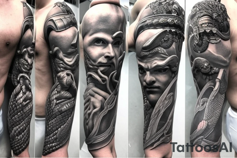 Achilles Trojan solider god holding the leesh of two dragons, one is doped up the other is unchained breathing fire take time increase all detail for arm sleeve tattoo idea