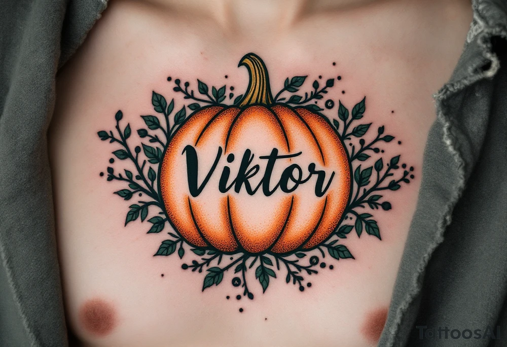 Viktor 30. 05. 2020 – A dark forest green and burnt orange pumpkin design, surrounding Viktor's birthdate, with black vine details for a spooky touch. tattoo idea